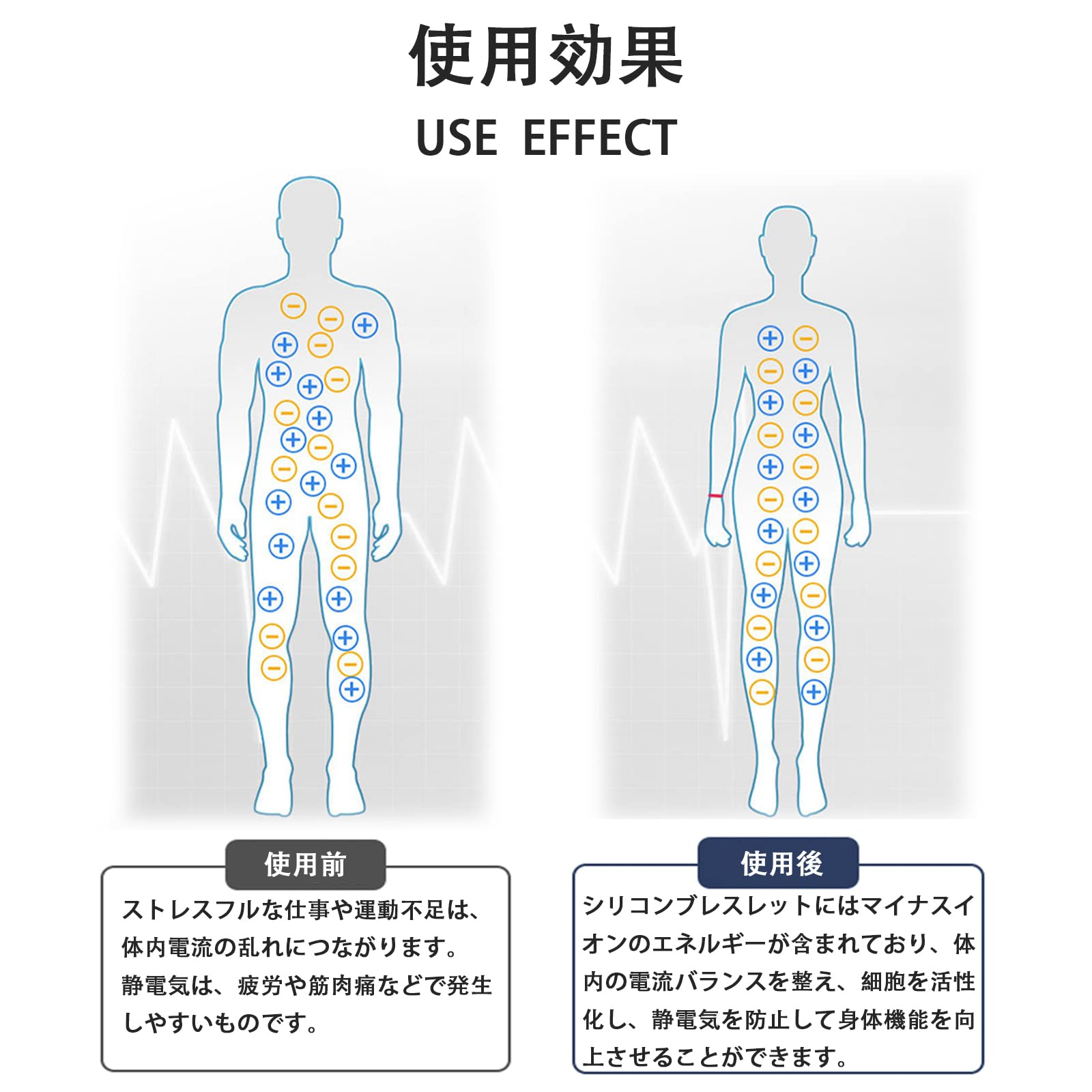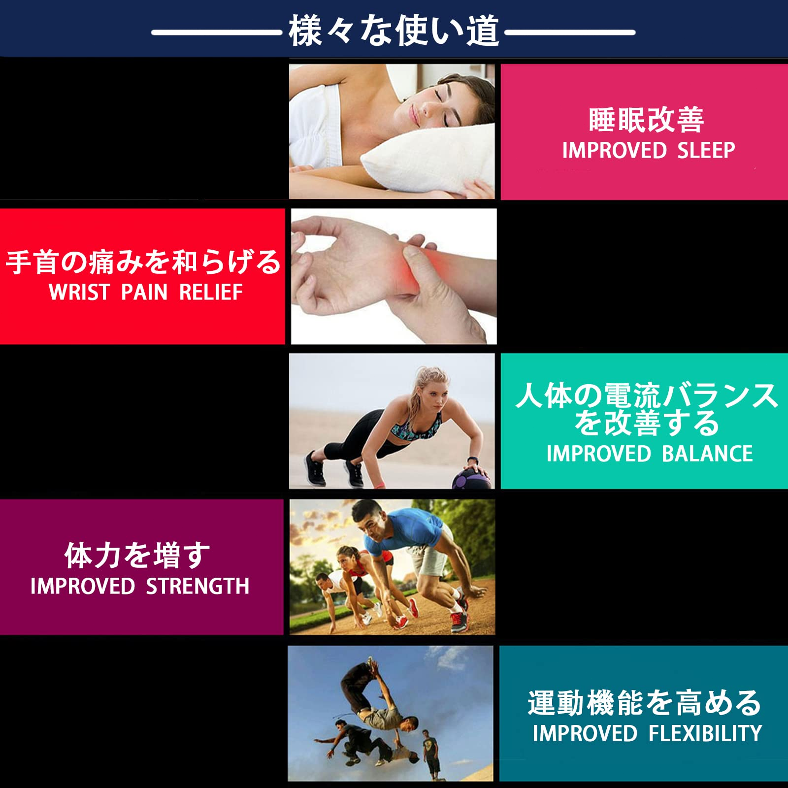 • 5.この高機能シリコンブレスレットは、血糖コントロールリングと静電気除去ブレスレットを一つに組み合わせた製品です。血糖調整の助けとなる磁石を含み、静電気による不快な体験を避けるための特殊機能を備えています。このシリコンブレスレットは高品質のシリコンで作られており、肌触りが良く、着け心地も抜群です。また、睡眠の質を改善し、精神をリラックスさせ、手首の筋肉の疲労や痛みを軽減する効果もあります。このブレスレットは、健康と快適性の両方を追求するあなたの日常生活をサポートします。