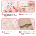4.お気になる図柄を切り取り、表面の透明保護シートをはがします;絵柄を下に肌につける;濡れたスポンジでしっかりシールに濡れます;20-30秒後に底面の白い紙を取り除き、自然乾燥すればいいです。