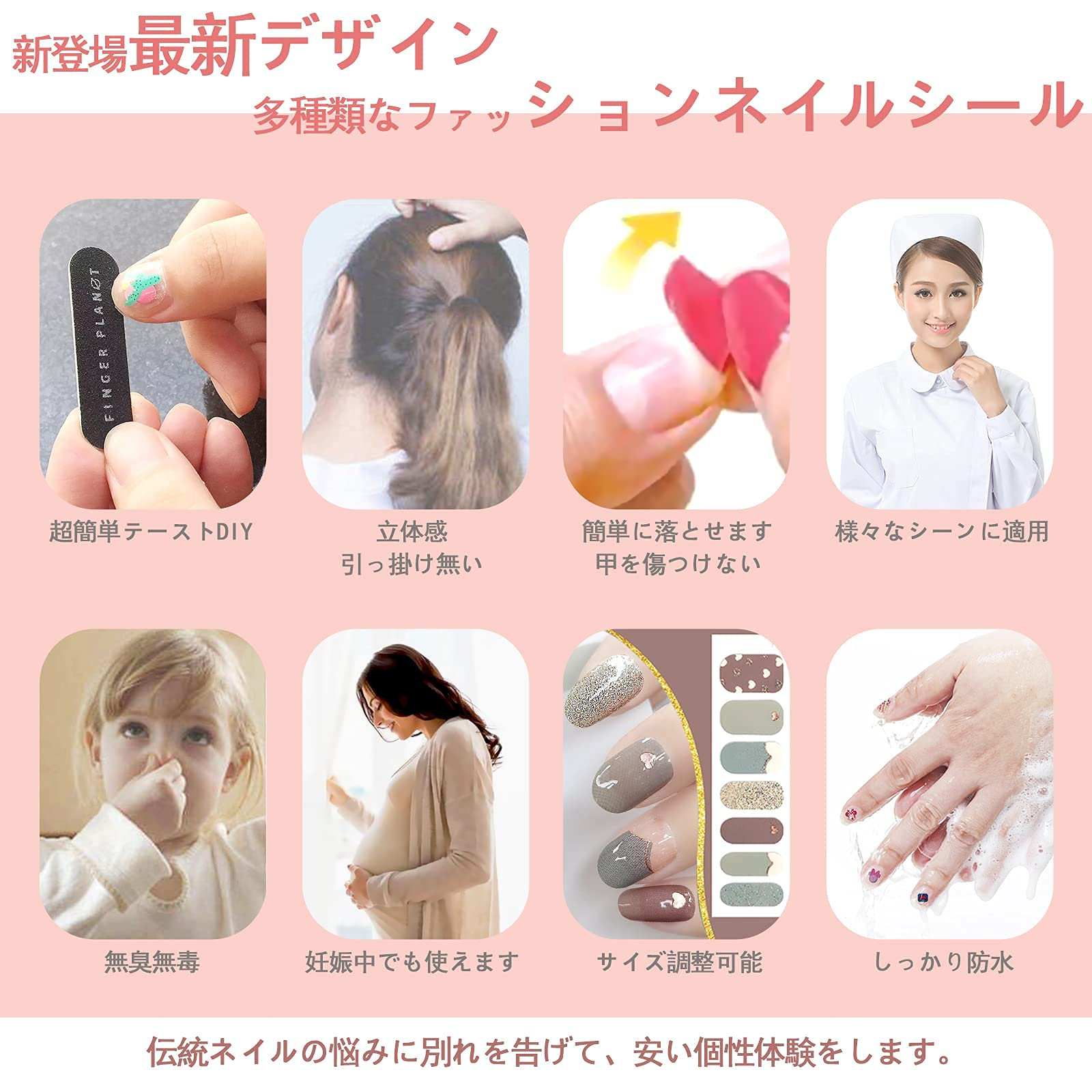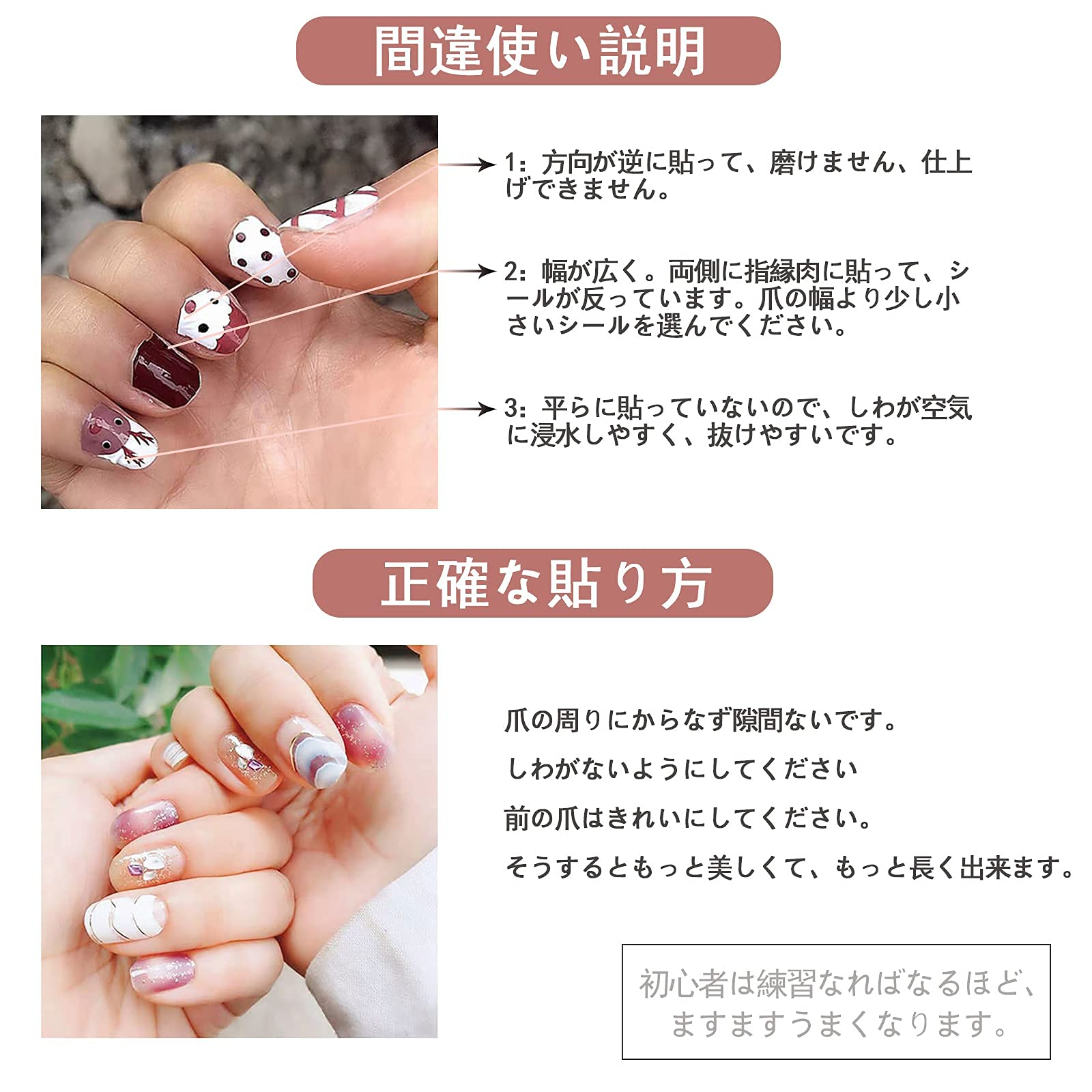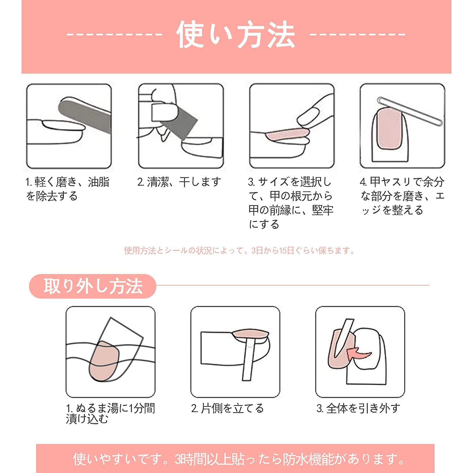 【簡単に貼り・落とせる】初心者でも15分で簡単に貼り付けます。シールの上にジェルを少し塗って長く保ちます、手で簡単に落とせます、爪に傷む心配なし。シールだけ(1週間程度)保ちます、マニキュアを塗ったら(10日間ぐらい)、ジェルで覆われているところ(2週間ぐらい)※個人差があります。