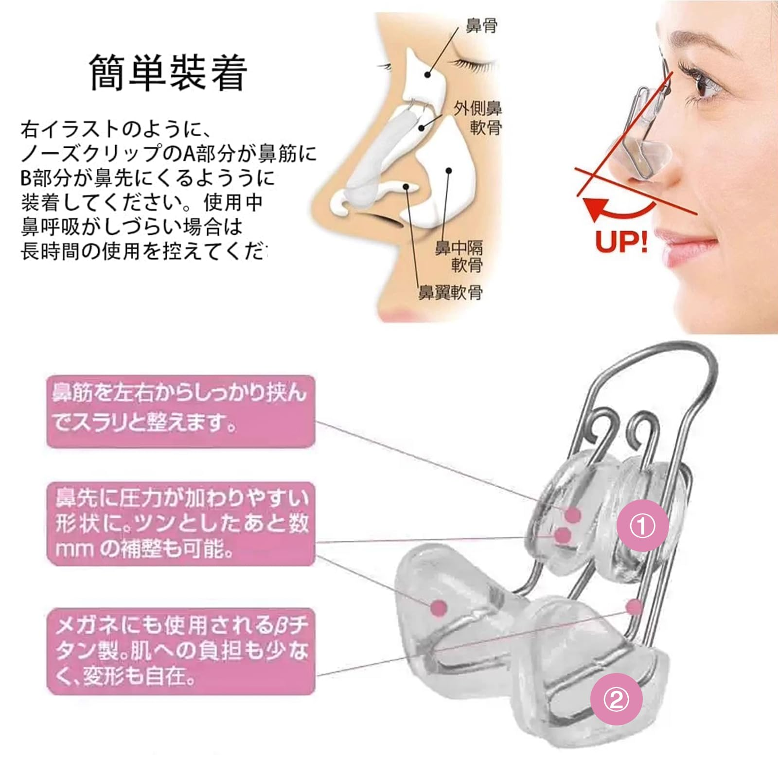 【商品素材】製品は最新の技術を採用して、チタン製のステンレスと医療用シリコンを採用して、長時間付けるても痕跡が残らない、シリカゲルの部分が鼻にぴったり合う強さを高めて、鼻の矯正効果を大いに高めました。