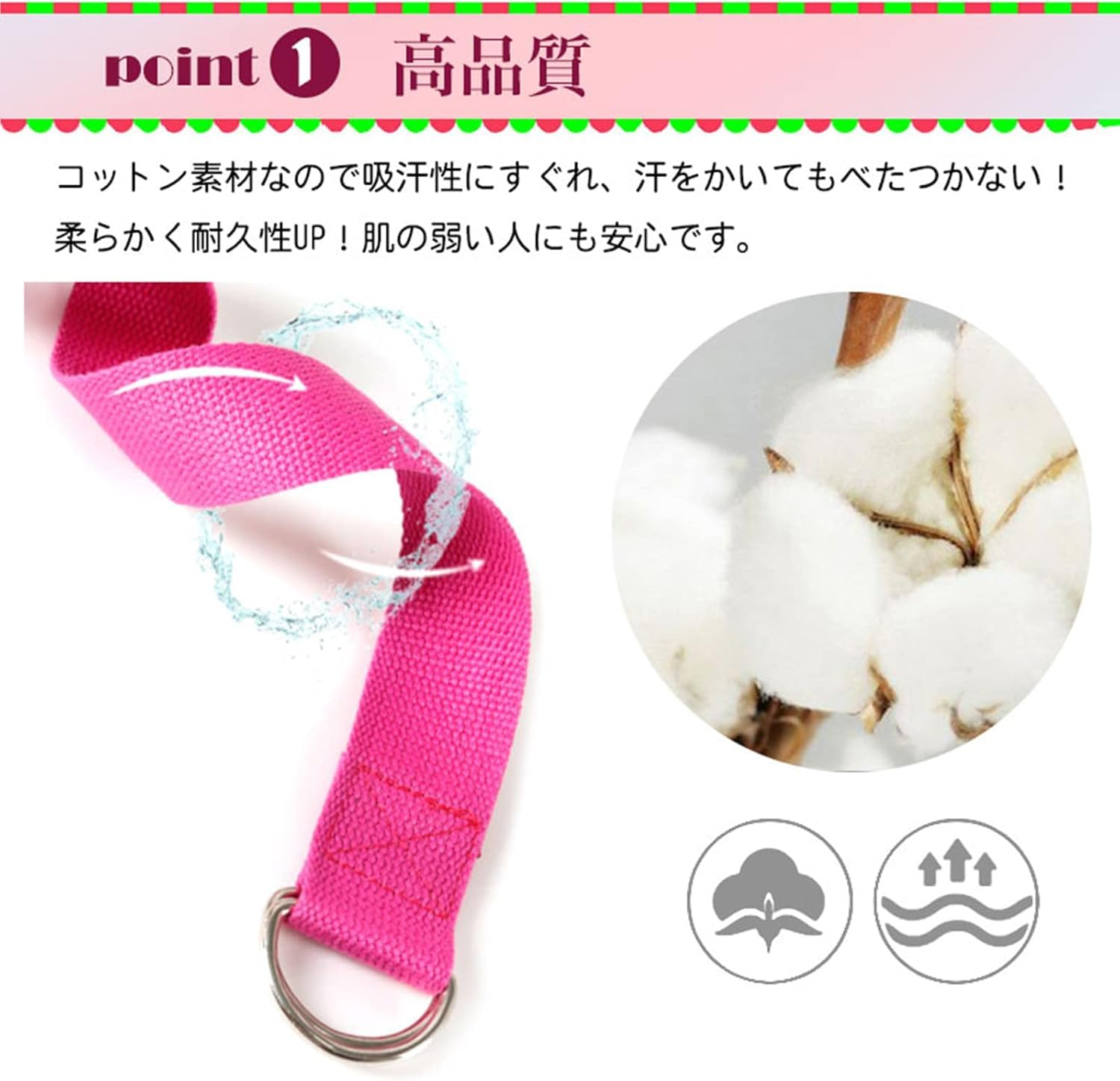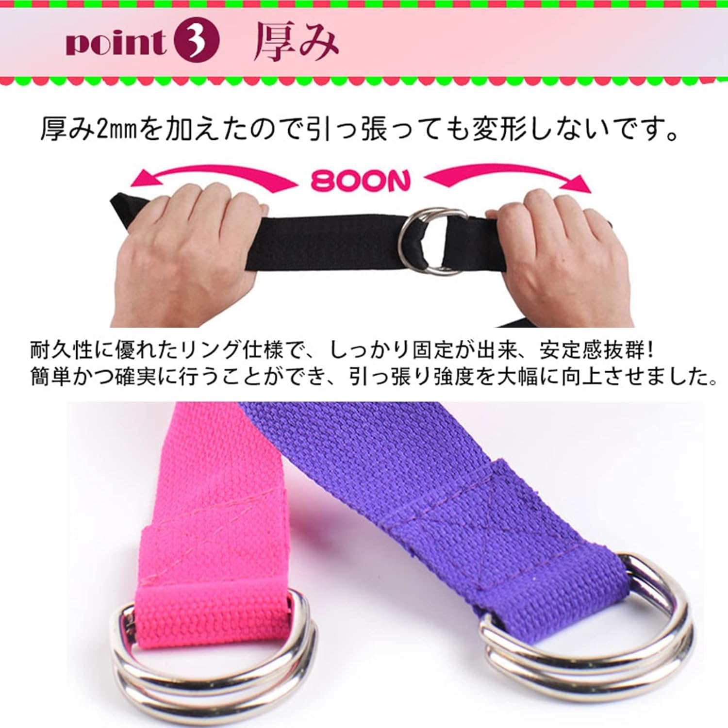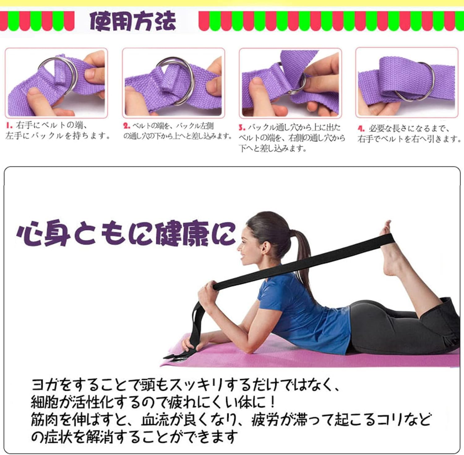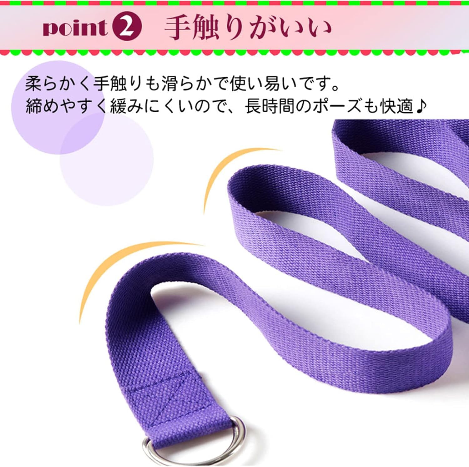 – 伸縮性はありませんが、ヨガ ストレッチ ストラップをストレッチして姿勢を維持する時間を延長するのに役立ちます。