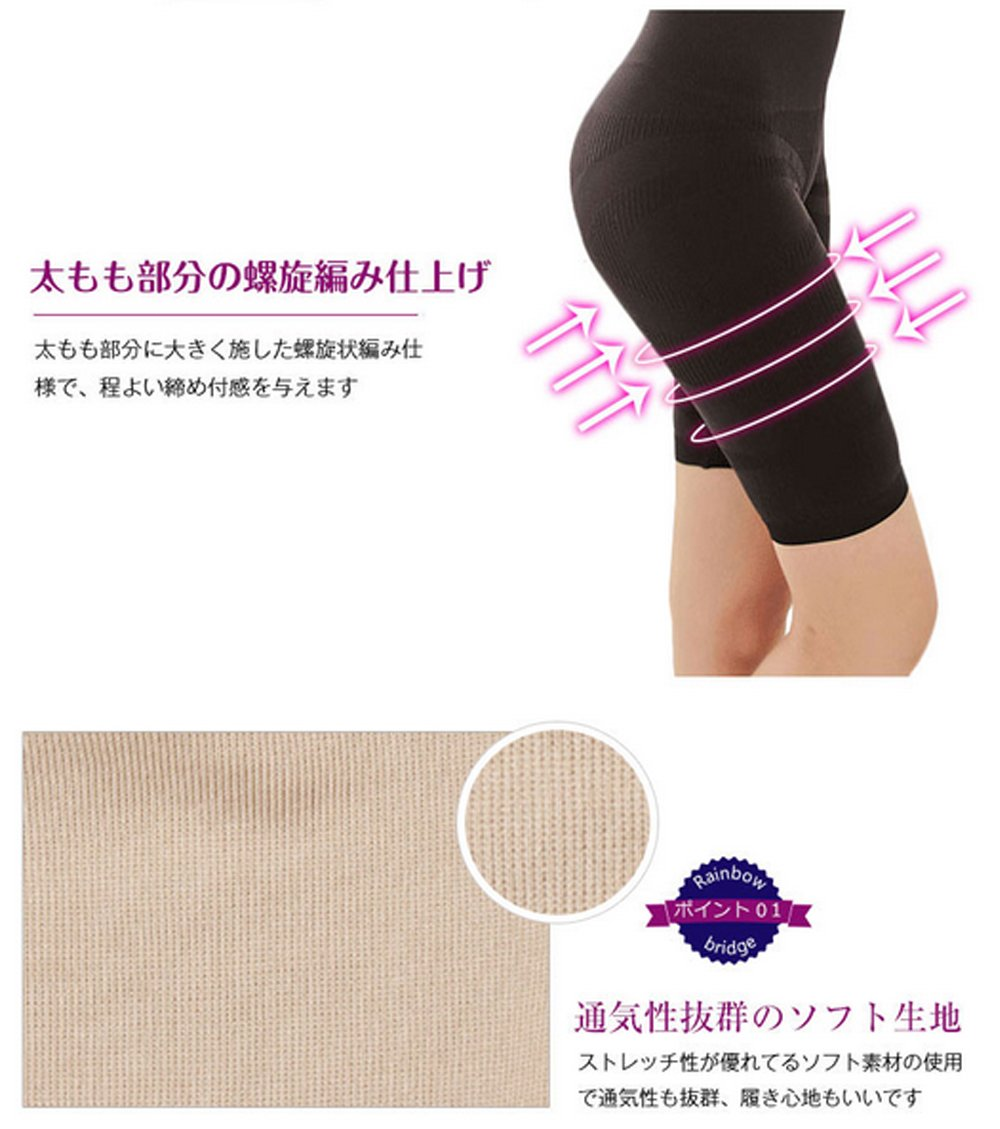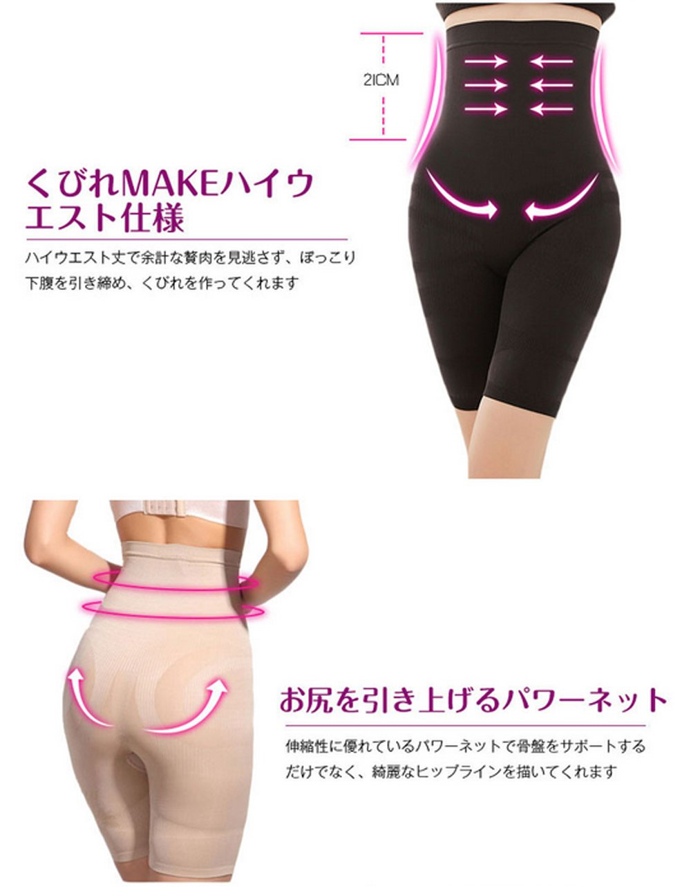 - ハイウエスト仕樣:ハイウエスト丈で余計な贅肉を見逃がさず、ぽっこり下腹を引き締め、くびれを作ってくれます。