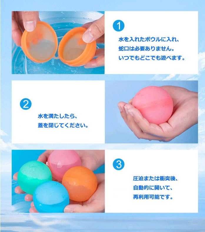 • 4、🎨【デザインと付加価値】 ◆ 可愛らしいマカロンカラー展開で、ファッショナブルなデザインがSNS映えします。 ◆ 夏のプレゼントとしても最適で、夏のイベントやパーティーの雰囲気を盛り上げてくれます。遊びながらストレス解消にもなります。 ◆ 水を入れると爽やかな感触を得られ、水遊びだけでなくストレス解消のおもちゃとしても使えます。子供たちは投げたり遊んだりするだけでなく、家庭やオフィスなどで揉んだりすることで、ストレスを和らげながら涼しさを感じることができます。